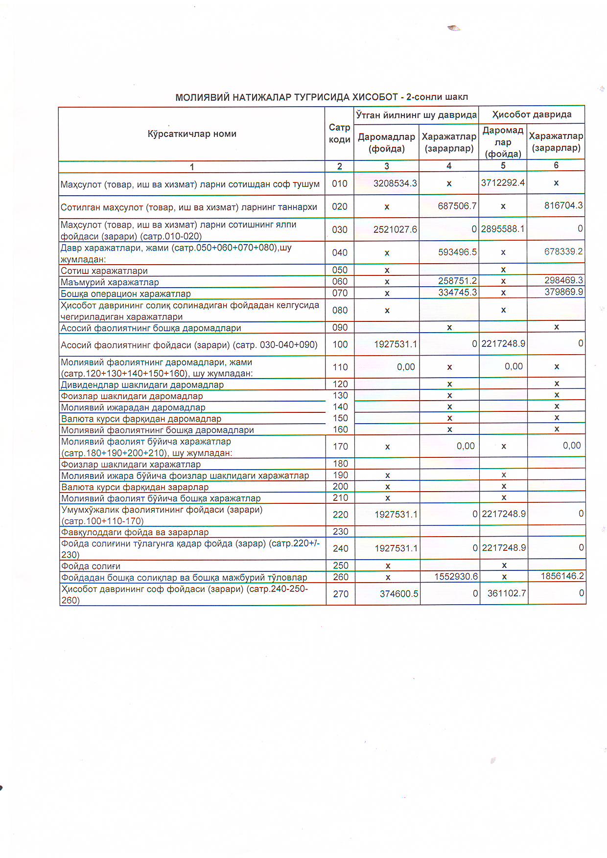 - Жамиятнинг 2017 йил якуни буйича фойда таксимотини тасдиклаш.